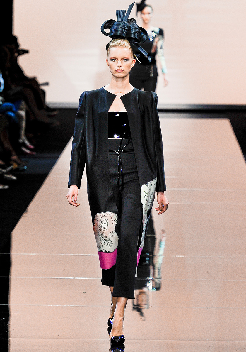 Giorgio Armani is clearly looking East. After a Resort collection that drew on imperial China, the Fall haute couture collection he showed today was an homage to Japan. While it's true that China represents and unprecedented business opportunity - meaning it's smart to market to it - Armani's connection to Japan is a deeper and more emotional on.