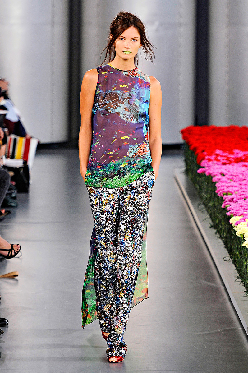 "Vive L'Art de Vivre" or Swimming in Pixels - The marvel, of course, is how Mary Katrantzou can even begin to mold all those complex components into anything resembling clothes, but she does, shaping those brilliantly patterned computer printouts into an increasingly broad range of clothing options. As a young designer, her clothes are hardly familiar in the mass sense, but enough of the lampshade and fishbowl skirts from her last two collections have been photographed editorially for Katrantzou's signature to have become unmistakble. That meant she needed to move out of home furnishing themes and onto something more abstract in order to prove to herself that she could successfully take on new, unexpected kinds of clothing like tailoring pantsuits, floaty chiffon, and more of the knitwear she started last season.