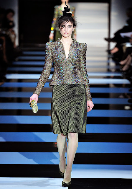 Like Karl Lagerfeld earlier in that couture show day, Armani set out to design his collection in a single color range: in his case, green - chartreuse (absinthe as mentioned before), poison green, teal, deep green. At first, the trop wasn't declared in full. His day wear, essentially pencil skirts with a folded-in frontal volume, or narrow pants - threw the emphasis on his singnature strength in jackets, with a couple of mean, super-luxe crocodile versions withn swooped-up shoulders, nipped waists and peplums as standouts.