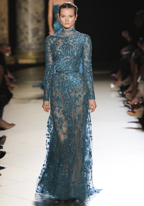 ELIE SAAB Fall 2012 Couture is entitled ‘In Constantinople’s Wake’ drawing inspiration from the Eastern Roman Empire and modern day Istanbul, Elie Saab’s fall 2012 haute couture collection was filled with ‘imperial splendor.’ Regal Ottoman empresses emerged from their court, the Sublime Porte onto the runway in opulent, be-jeweled gowns. Beauty Karlie Kloss led the noble party in a shimmering black caftan silhouette embroidered with decadent black tulle.