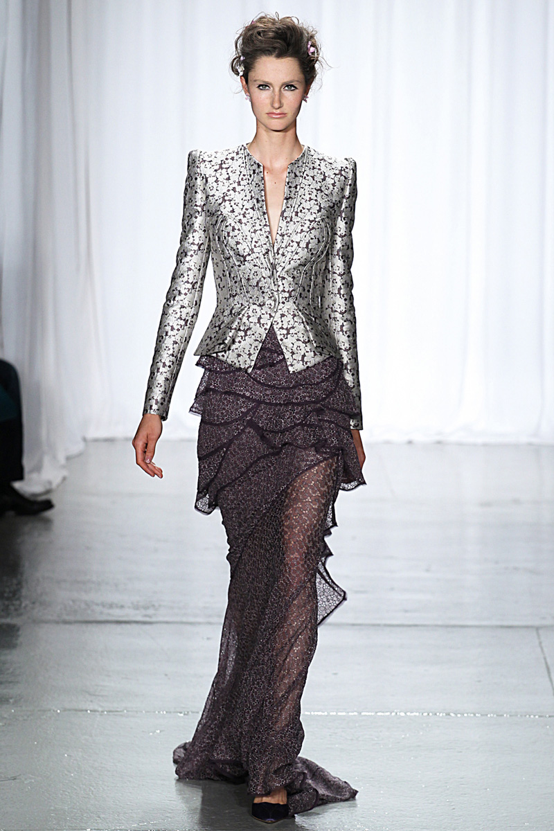 "The collection invokes a romantic femininity with a touch of whimsy. A manipulation of emotional textures, a layering of prints, and tonalities of color within a single piece evoke a modern-day Sarah Bernardt," said Zac Posen, inspirations out of the 1911 French film La Dame aux Camélias.