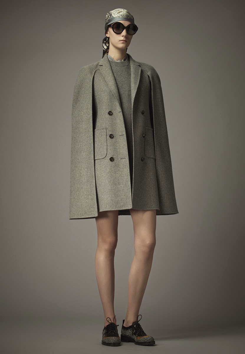 The overarching inspiration for pre-fall started with this idea of the stylish eccentric in the mold of Anna Piaggi or Isabella Blow, an increasingly rare and precious breed, not least where the red carpet is concerned. In fact bold and unexpected flourishes went from day to night; shiny feathers sprigged the lapels of a slate-gray overcoat and the sleeve of a cocktail dress alike, and the traditional mink coat was reconfigured with a stunning geometric pattern. Where most designers have been pondering the basics of transitional dressing, these daring, stand-out-and-be-noticed designs came as a shockingly chic antidote.